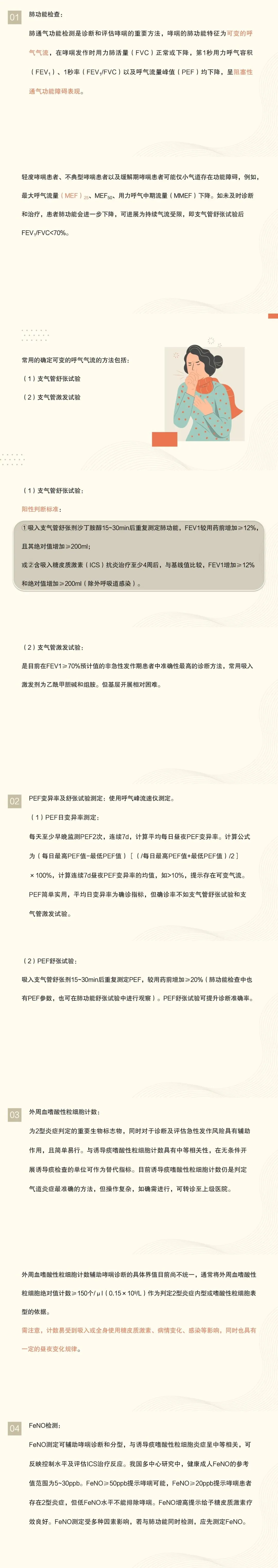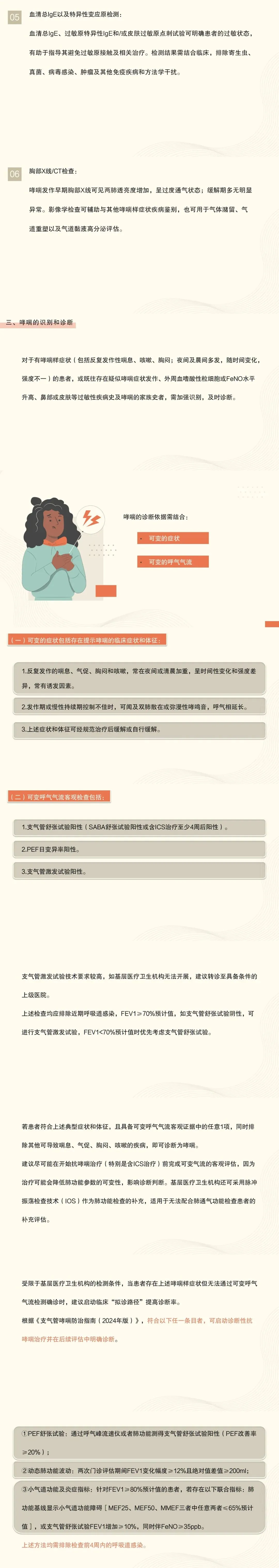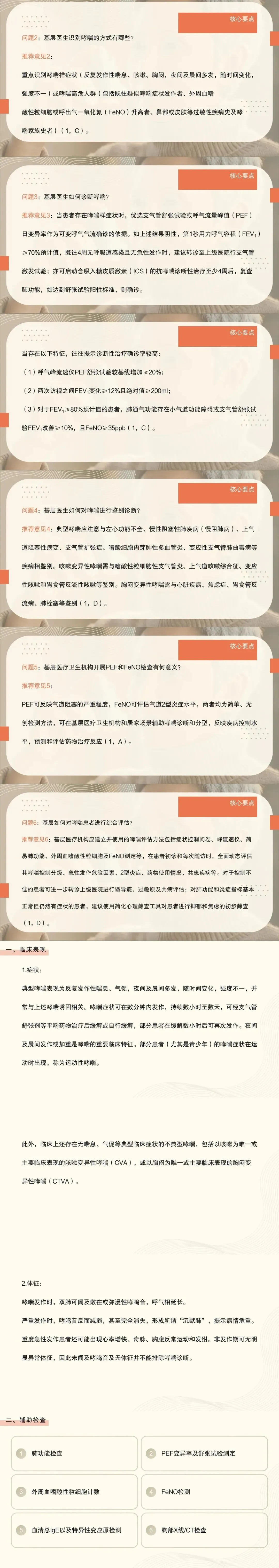 2:重点识别哮喘样症状(反复发作性喘息、咳嗽、胸闷,夜间及晨间多发,随时间变化,强度不一)或哮喘高危人群(包括既往疑似哮喘症状发作者、外周血嗜酸性粒细胞或呼出气一氧化氮(FeNO)升高者、鼻部或皮肤等过敏性疾病史及哮喘家族史者)。
