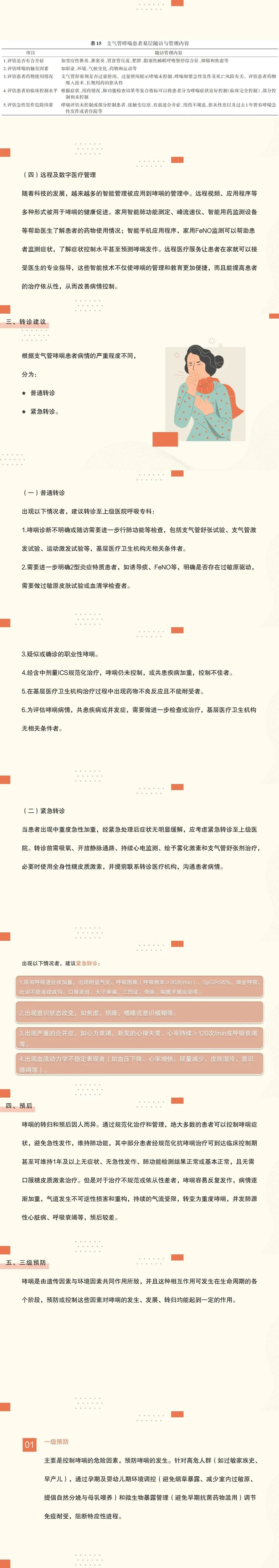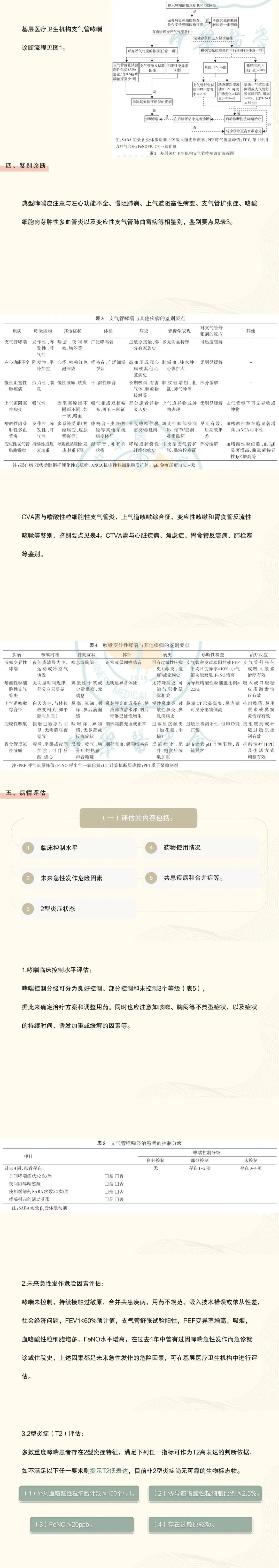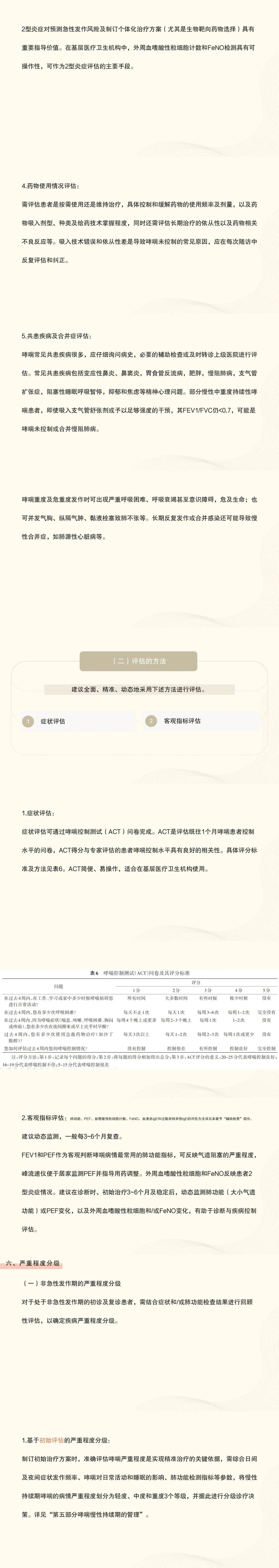 6:基层医疗机构应建立并使用的哮喘评估方法包括症状控制问卷、峰流速仪、简易肺功能、外周血嗜酸性粒细胞及FeNO测定等,在患者初诊和每次随访时,全面动态评估其哮喘控制分级、急性发作危险因素、2型炎症、药物使用情况、共患疾病等。对于控制不佳的患者可进一步转诊上级医院进行诱导痰、过敏原及共病评估;对肺功能和炎症指标基本正常但仍然有症状的患者,建议使用简化心理筛查工具对患者进行抑郁和焦虑的初步筛查。