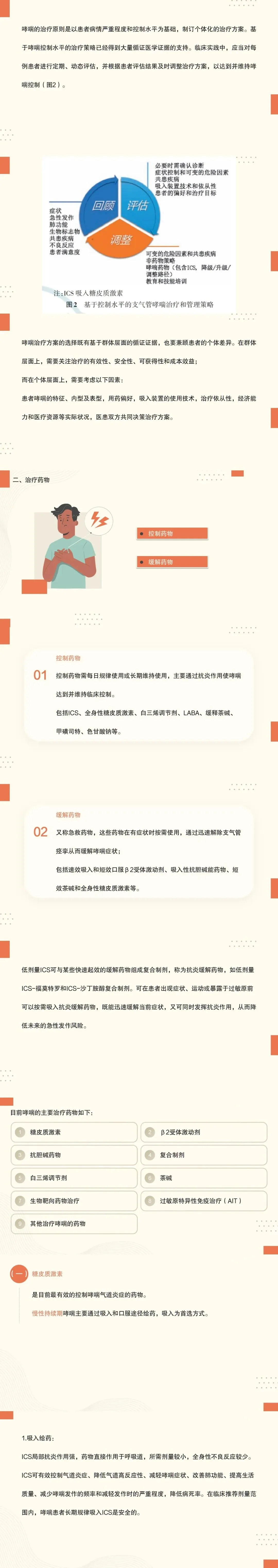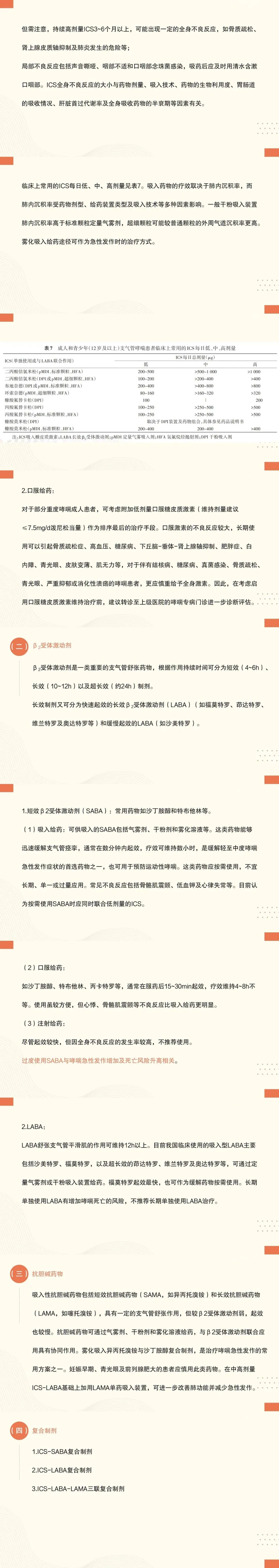 9:ICS-长效β2受体激动剂(LABA)是临床上常用于哮喘治疗的复合制剂,包括有不同规格的布地奈德-福莫特罗干粉剂、丙酸氟替卡松-沙美特罗干粉剂、丙酸倍氯米松-福莫特罗气雾剂、莫米松-茚达特罗干粉剂等;ICS-LABA具有协同的抗炎和平喘作用,可获得相当于或优于单用加倍剂量ICS的疗效,并可增加患者的依从性、减少大剂量ICS的不良反应,低剂量ICS-福莫特罗复合制剂可作为按需使用药物,适合用于哮喘患者的全程长期治疗。