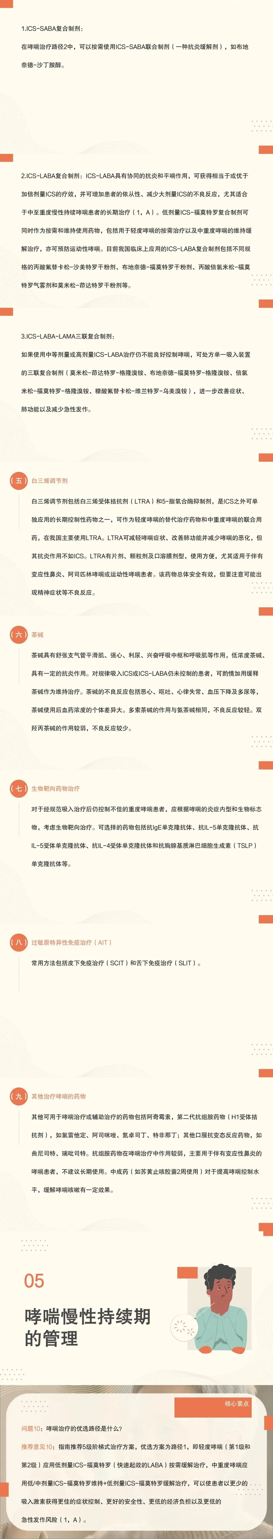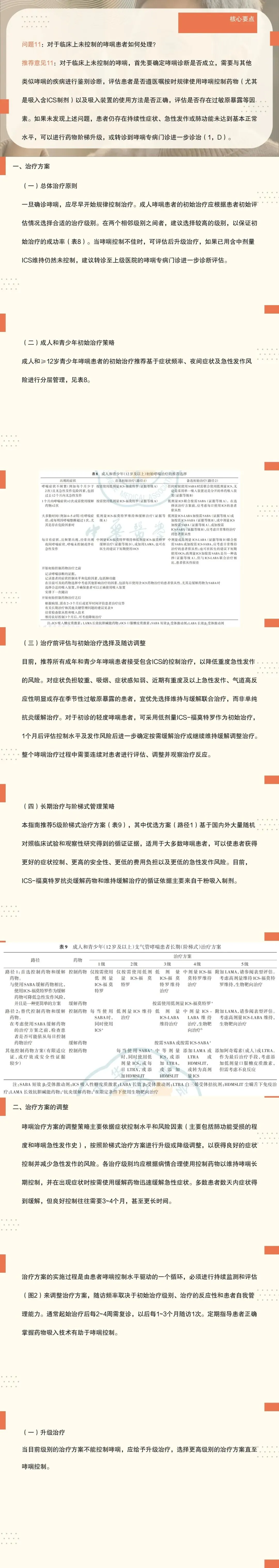 10:指南推荐5级阶梯式治疗方案,优选方案为路径1,即轻度哮喘(第1级和第2级)应用低剂量ICS-福莫特罗(快速起效的LABA)按需缓解治疗,中重度哮喘应用低/中剂量ICS-福莫特罗维持+低剂量ICS-福莫特罗缓解治疗,可以使患者以更少的吸入激素获得更佳的症状控制、更好的安全性、更低的经济负担以及更低的急性发作风险。