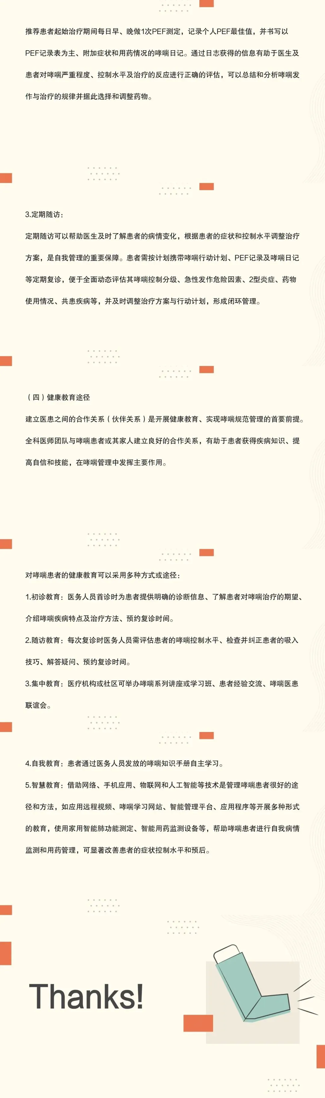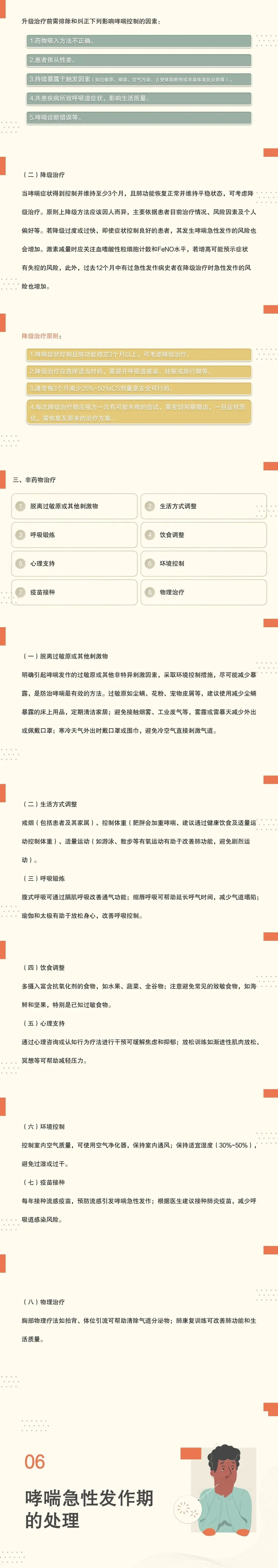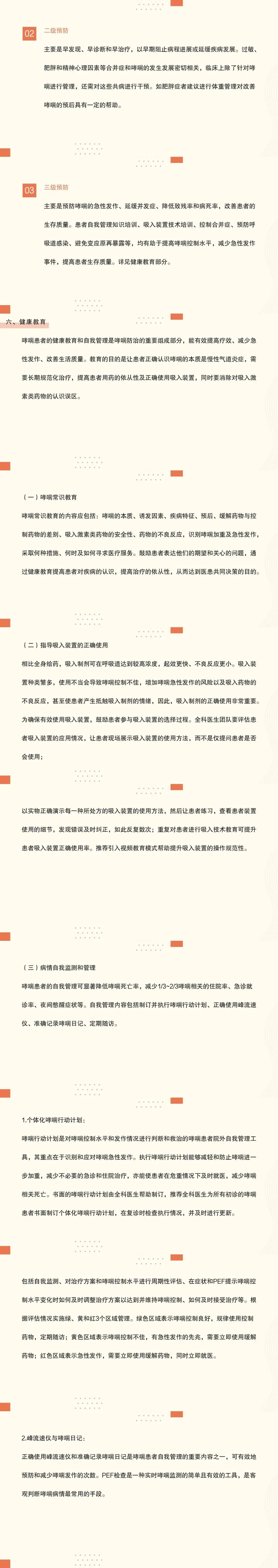 23:疾病预防包括控制哮喘的相关危险因素,针对高危人群进行孕期及婴幼儿期环境调控和微生物暴露管理,调节免疫耐受,预防哮喘的发生;对哮喘高危人群采取早筛、早诊、早治“三早”方案;加强患者自我管理知识培训、吸入装置技术培训、控制共病、预防呼吸道感染、避免变应原再暴露,提高哮喘控制水平,预防哮喘的急性发作、延缓并发症的出现、降低致残率和病死率,改善患者的生存质量。