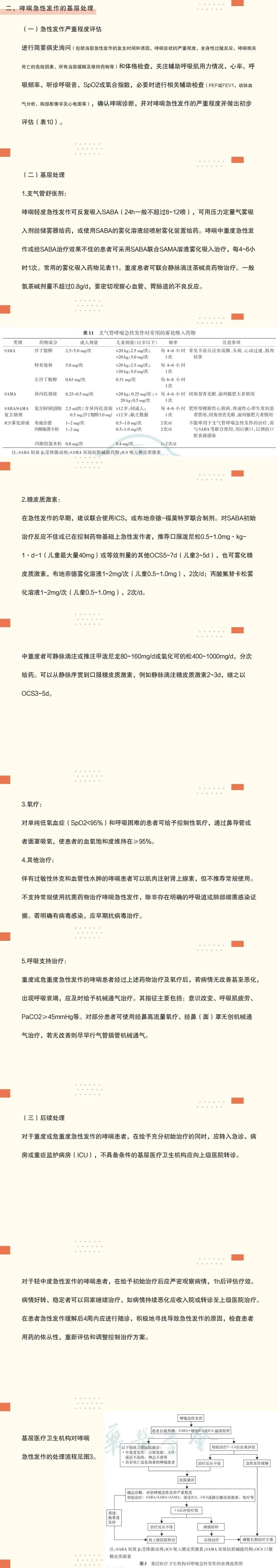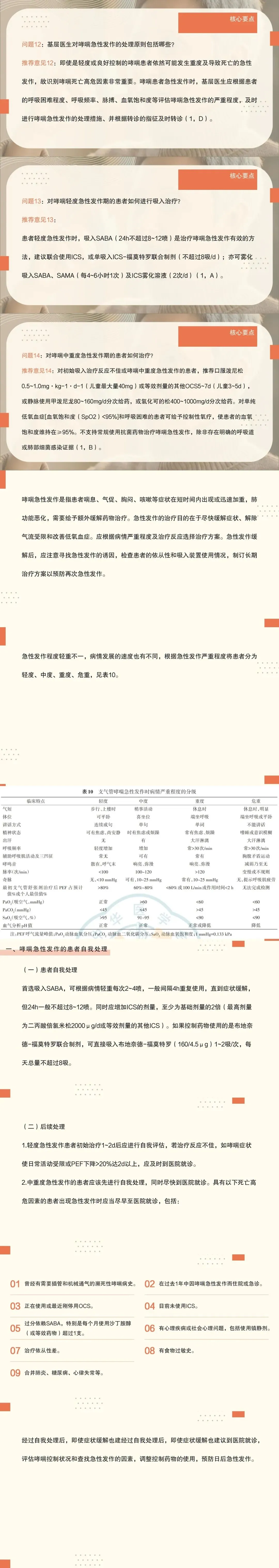 12:即使是轻度或良好控制的哮喘患者依然可能发生重度及导致死亡的急性发作,故识别哮喘死亡高危因素非常重要。哮喘患者急性发作时,基层医生应根据患者的呼吸困难程度、呼吸频率、脉搏、血氧饱和度等评估哮喘急性发作的严重程度,及时进行哮喘急性发作的处理措施、并根据转诊的指征及时转诊。