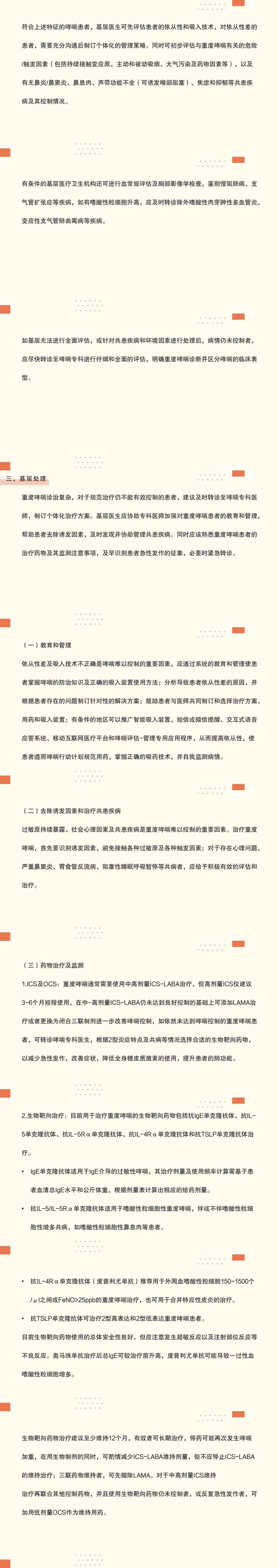 16:对于中高剂量ICS-LABA规范治疗3个月及以上仍不能有效控制的重度哮喘患者,及时转诊至哮喘专科医师,制订个体化治疗方案。基层医师应协助专科医师加强对重度哮喘患者的教育和管理,帮助患者去除诱发因素,及时发现并协助管理共患疾病;同时应熟悉重度哮喘患者的治疗药物及其监测注意事项,及早识别患者急性发作的征象,必要时紧急转诊。