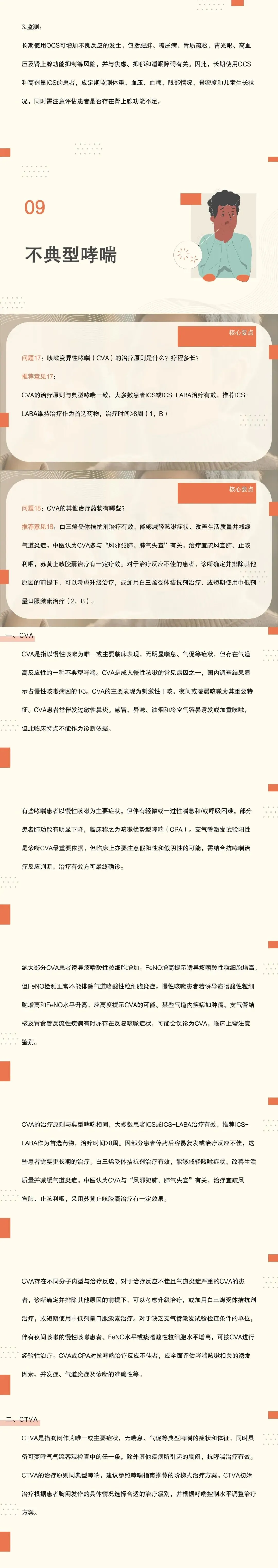17:CVA的治疗原则与典型哮喘一致,大多数患者ICS或ICS-LABA治疗有效,推荐ICS-LABA维持治疗作为首选药物,治疗时间>8周。