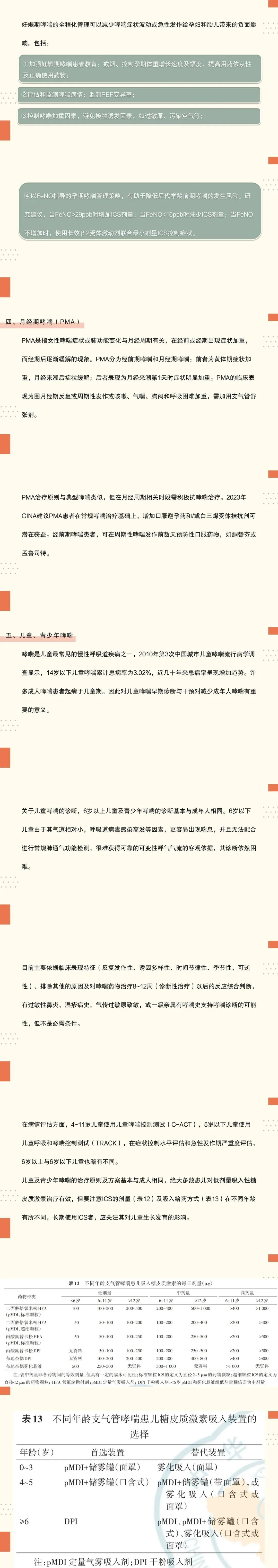 19:妊娠期哮喘治疗原则与典型哮喘相同。使用含ICS的吸入药物,可减少全身的吸收和对胎儿的影响。妊娠期哮喘治疗过程中应持续对孕妇和胎儿进行评估,调整并观察治疗反应。当哮喘控制不佳时,应及时按照阶梯治疗原则及时升级药物治疗。降阶梯治疗应在分娩后再考虑,不推荐在备孕或妊娠期间自行停止含ICS的吸入药物。如果妊娠期哮喘吸入中剂量ICS无法获得良好控制或发生急性发作时,建议转到上级医院及时进行评估与治疗