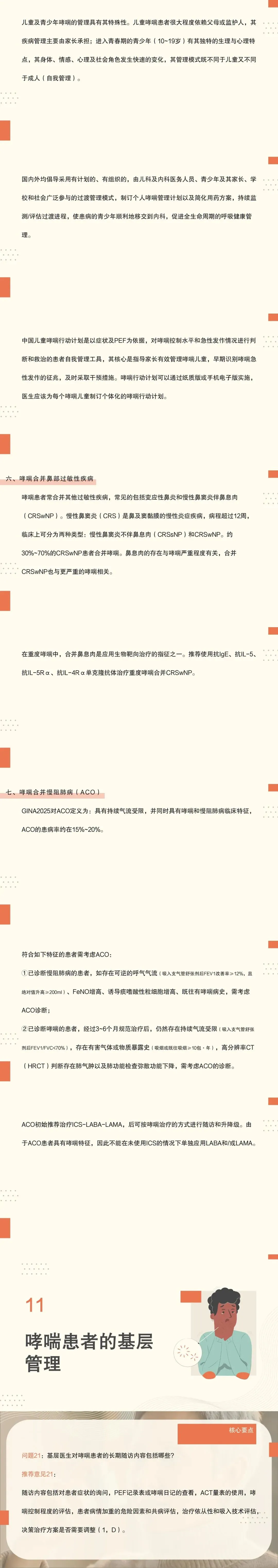 22:起始治疗阶段建议每2~4周复诊评估病情;进入稳定期后可调整为每1~3个月随访1次。每次复诊时,除评估患者控制情况,还需核查患者吸入技术掌握情况及依从性,并针对性强化指导。