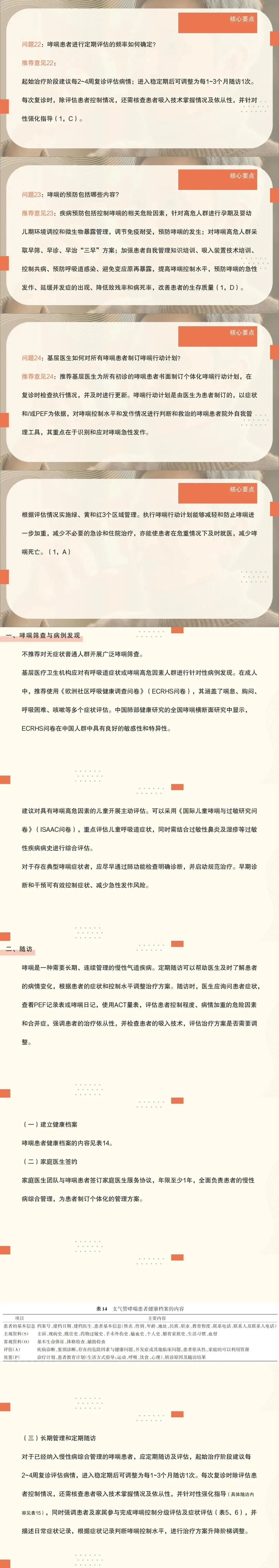 21:随访内容包括对患者症状的询问,PEF记录表或哮喘日记的查看,ACT量表的使用,哮喘控制程度的评估,患者病情加重的危险因素和共病评估,治疗依从性和吸入技术评估,决策治疗方案是否需要调整。
