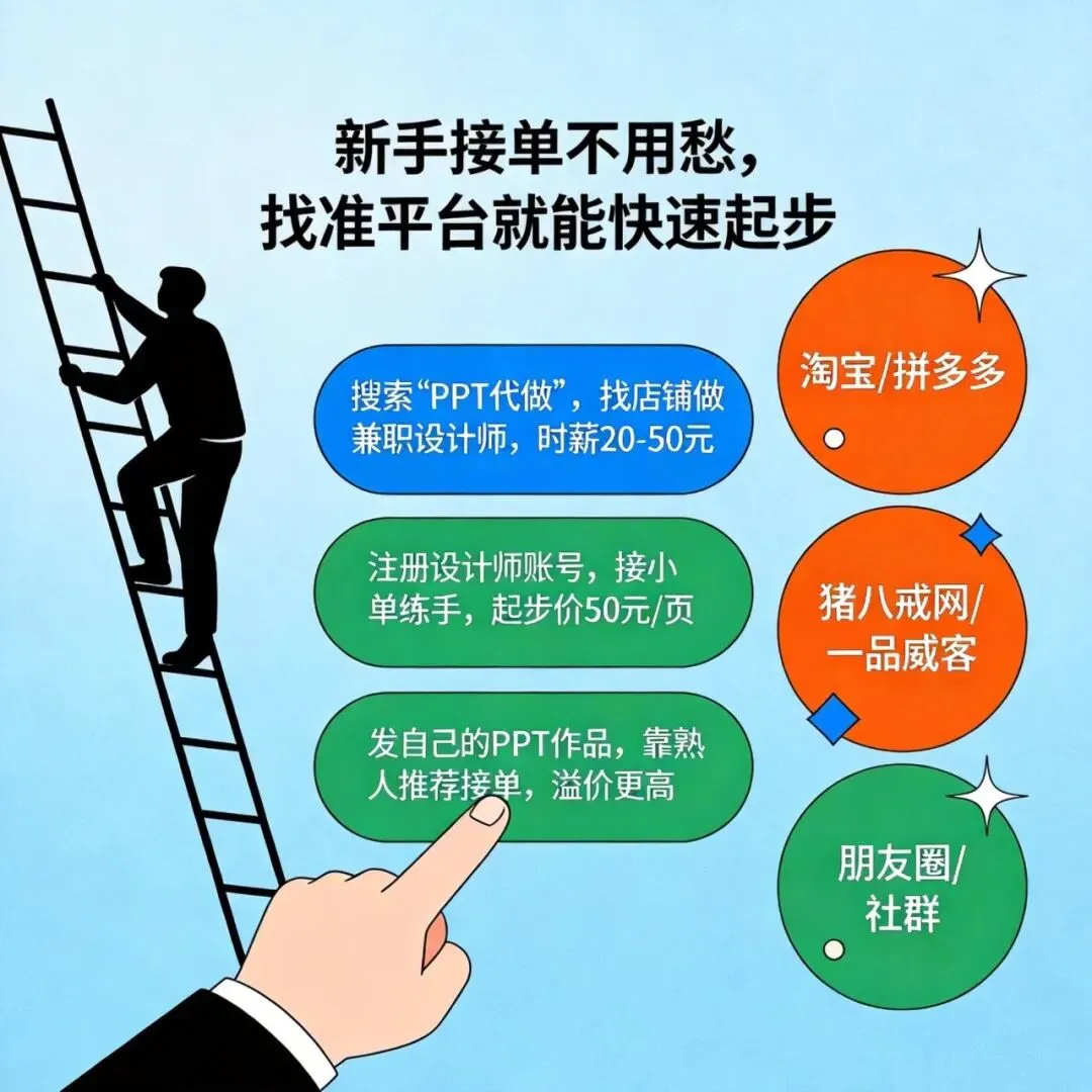 具体怎么做: 1. 淘宝/拼多多:搜索"PPT代做",找店铺做兼职设计师,时薪20-50元 2. 猪八戒网/一品威客:注册设计师账号,接小单练手,起步价50元/页 3. 朋友圈/社群:发自己的PPT作品,靠熟人推荐接单,溢价更高