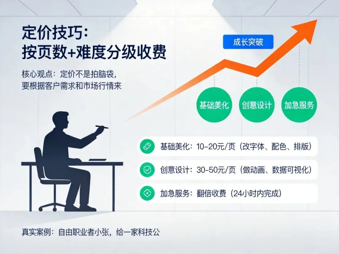 具体怎么做: 1. 基础美化:10-20元/页(改字体、配色、排版) 2. 创意设计:30-50元/页(做动画、数据可视化) 3. 加急服务:翻倍收费(24小时内完成)