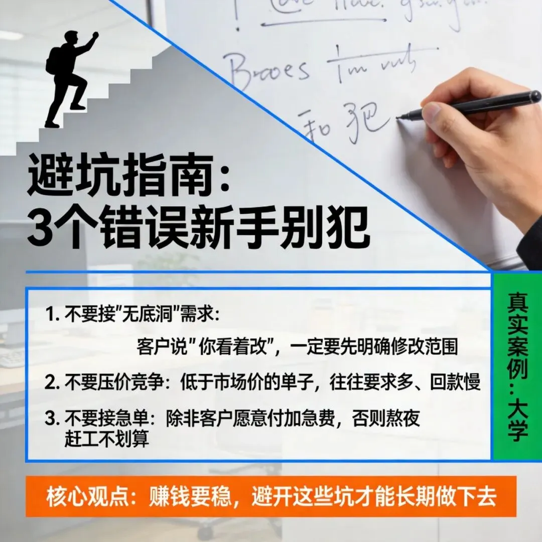 具体怎么做: 1. 不要接"无底洞"需求:客户说"你看着改",一定要先明确修改范围 2. 不要压价竞争:低于市场价的单子,往往要求多、回款慢 3. 不要接急单:除非客户愿意付加急费,否则熬夜赶工不划算
