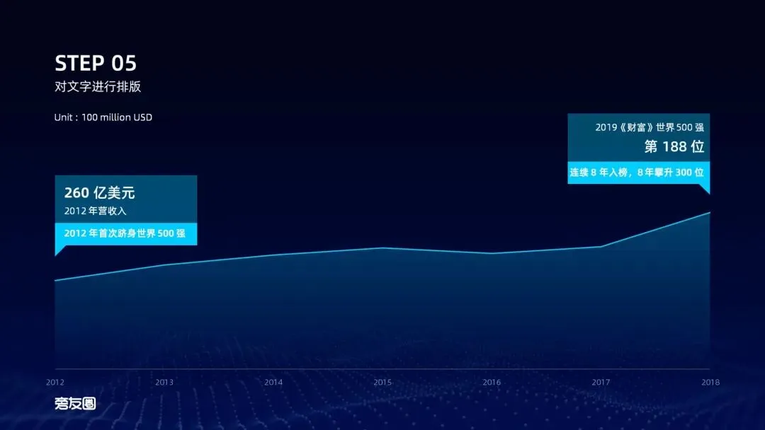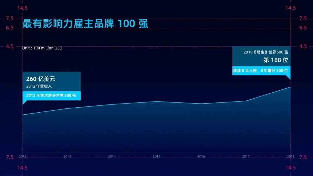 - 每一个耀眼的成绩,背后都是日复一日的坚持。 从 260 亿美元到世界 500 强第 188 位,是 8 年的厚积薄发,也是 PPT 中每一个细节的精心打磨。