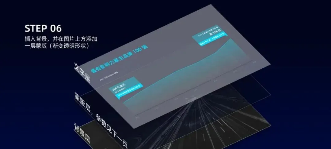 页面上有两个关键信息点:2012 年的首次突破和 2019 年的行业地位。我决定用 “信息卡片” 的形式,让这些数据更具视觉冲击力。我先插入一个矩形形状,填充为半透明的深蓝色,设置 “无轮廓”;在卡片内分三行输入文字:“260 亿美元”(36 号,白色加粗)、“2012 年营业收入”(28 号,白色)、“2012 年首次跻身世界 500 强”(24 号,白色),调整文字行间距和对齐方式,让信息层级分明。