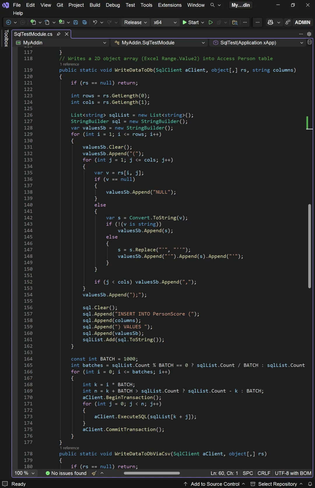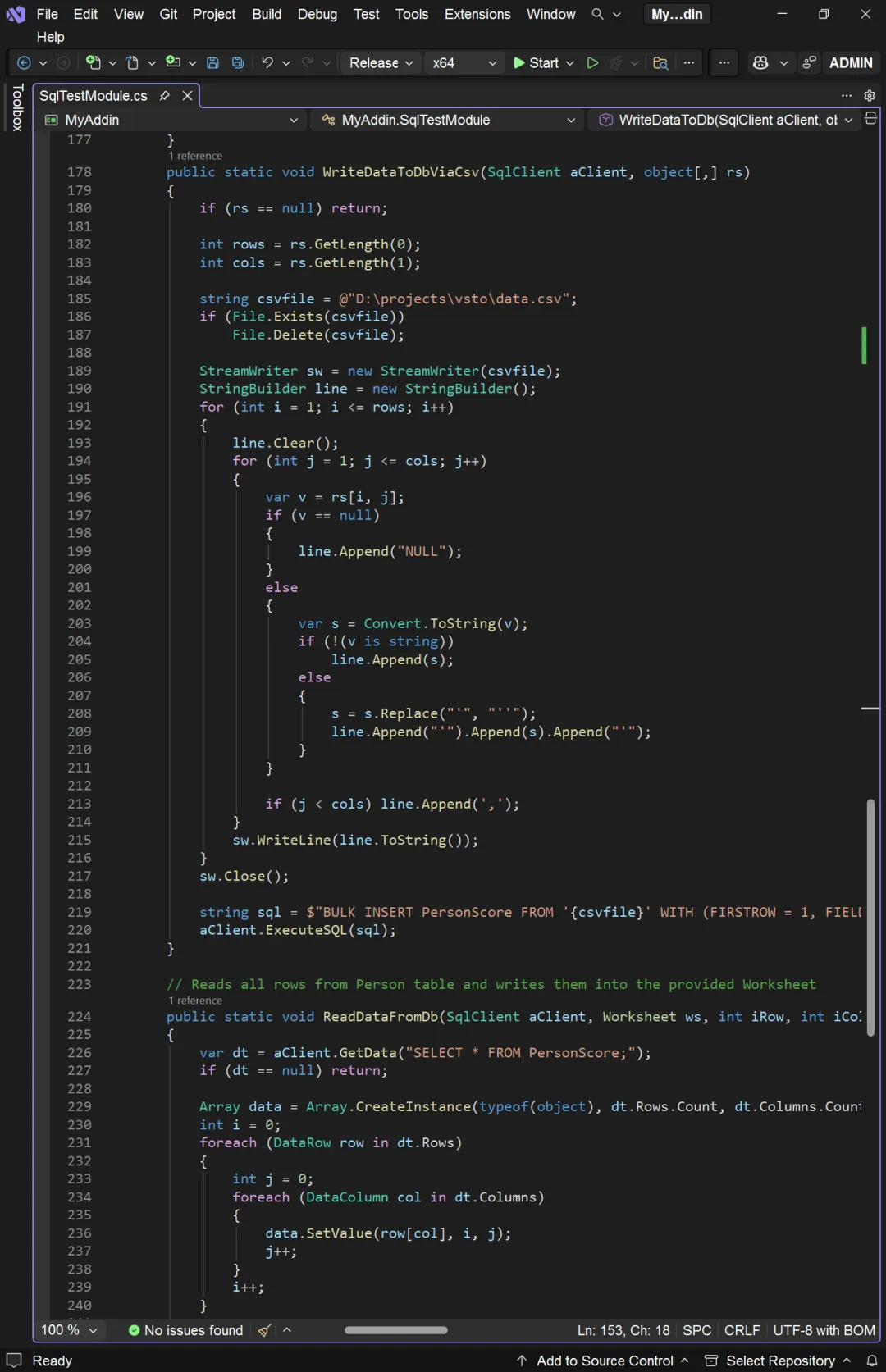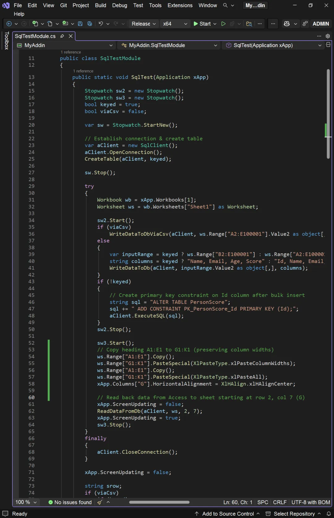 从上图可以看出,前三种实现方式的效率相差不大,后两种方式的效率极高。从四种针对 SQL Server 的实现方式可以看出,有没有 Primary Key,结果相差不大。我们的项目名称为 MyAddin,所以对应的名字空间也是 MyAddin。创建 MyAddin 项目时,Visual Studio 自动生成 ThisAddIn 类。这个类包含两个事件处理器:一个是加载项加载时的 ThisAddIn_Startup,一个是加载项卸载时的 ThisAddIn_Shutdown。我们在 Startup 事件处理器中调用数据集写入数据库的程序 SqlTest 或 AceTest。- 将数据集写入数据库表的 WriteDataToDb/WriteDataToDbViaCsv: