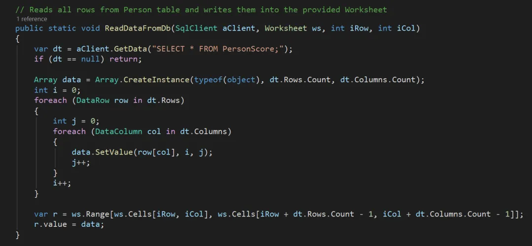 WriteDataToDb 代码中值得一说的,是最后的批量执行部分。我们要写入数据库的数据集有 10 万条记录,会形成 10 条 INSERT INTO 的 SQL 语句。执行大量的 INSERT INTO 语句,需要包括在事务处理语句中批量执行。但数据库引擎执行事务处理时,也不是无限制的,批量也是有“粒度”的,这个“粒度”一般是 5000 至 10000 条 SQL 语句。我们的代码中取为 1000,取 5000 似乎效果更好一些。下面来看 WriteDataToDbViaCsv:WriteDataToDbViaCsv 与 WriteDataToDb 的不同之处在于,这里不是构造 INSERT INTO 的 SQL 语句,而是将数据记录形成 CSV 格式,写入 .csv 文件。然后执行 BULK INSERT 语句,从 .csv 文件中读取数据,批量写入数据库。从文章开头的测试结果中可以看出,BULK INSERT 的效率极高。所以经常用于海量数据的迁移以及 ETL(Extract, Transform, Load)场景中。ReadDataFromDb 的代码中,有两点值得说一说:- 创建二维的动态数组:Array.CreateInstance 可以用于创建各种类型的动态数组,创建二维数组的方法接受三个参数: