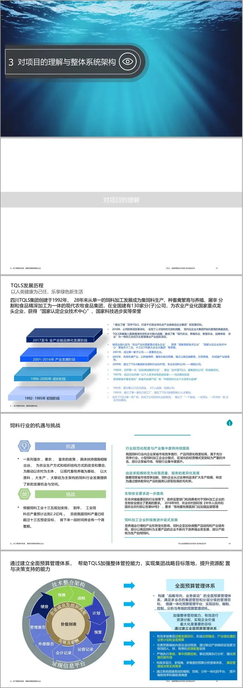 TQLS集团作为农业产业化国家重点龙头企业,经过28年发展已形成集饲料生产、种畜禽繁育与养殖、屠宰分割和食品精深加工为一体的现代农牧食品产业体系。随着集团规模扩大和业务复杂度提升,传统的预算管理和报表合并方式已难以满足集团化管控需求。本项目旨在构建"战略导向、业务驱动"的全面预算管理体系,实现集团战略目标有效落地,提升资源配置效率与决策支持能力。