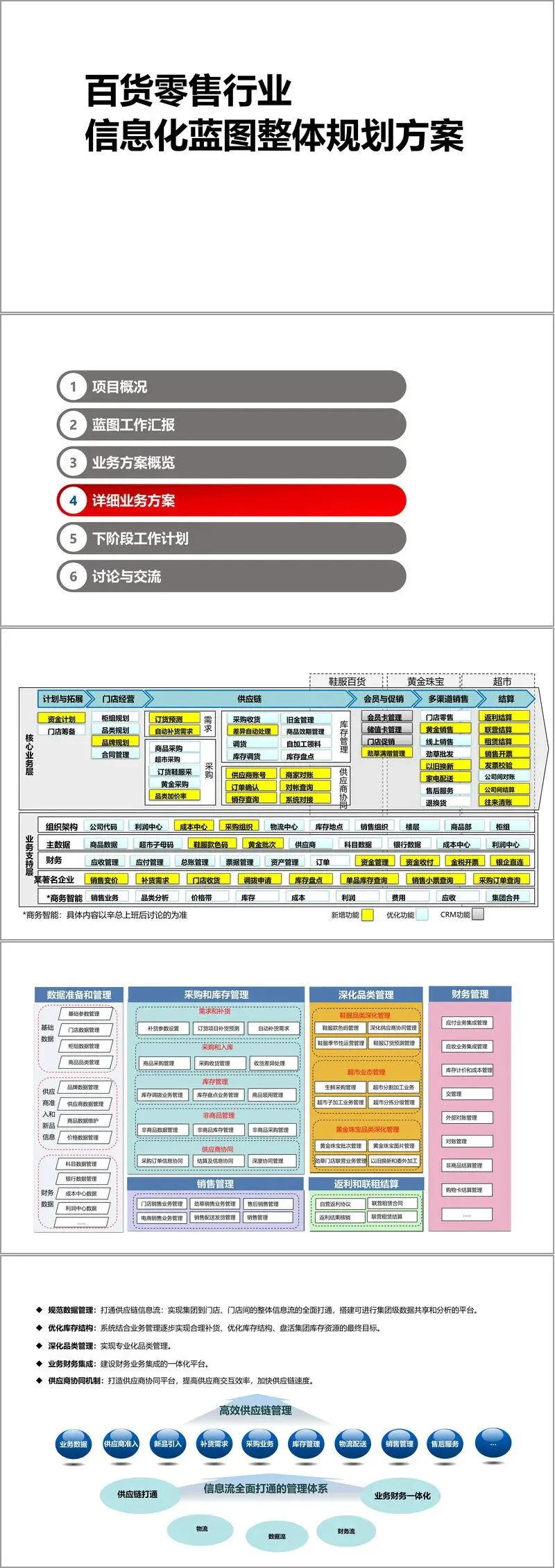 在整体业务架构设计上,方案构建了以核心业务层、业务支持层和深化品类管理为主体的三层架构。核心业务层覆盖计划与拓展、门店经营、供应链管理、会员与促销、多渠道销售和结算等关键业务领域。业务支持层则包括组织架构、主数据管理和财务核算等基础支撑体系。特别值得关注的是,方案创新性地提出了深化品类管理的纵向架构,针对鞋服百货、黄金珠宝、超市等不同业态的特点,设计了专业化的管理方案。