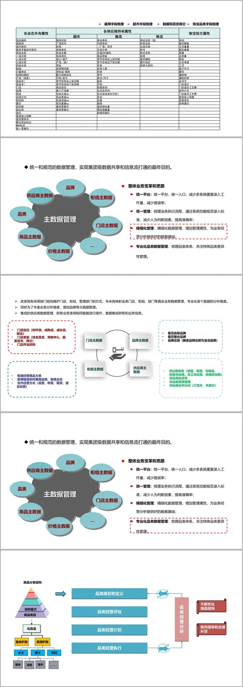 主数据管理作为信息化建设的基础,方案提出了统一规范的管理目标。通过建立统一的数据管理平台,实现集团级数据共享,减少多系统重复录入工作量。在具体实施上,方案设计了完整的商品分类体系,针对不同品类规划了差异化的层级结构,如珠宝运动品类采用五级结构,家电类采用三级结构,其他品类采用四级结构,这种灵活的等级设置有效解决了现有分类体系层级不对等的问题。