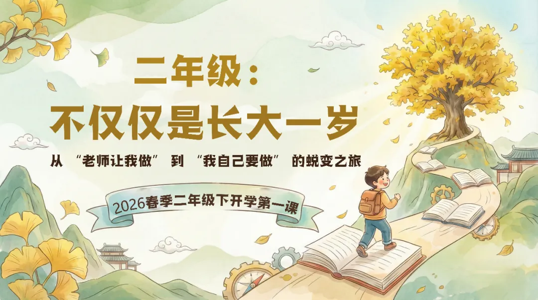 很高兴在这与您相遇,如果您是一位班主任老师,每天除了应对繁重的教学工作,还要加班整理班级、教务、教研、课件PPT资料,请关注下方的“春雨教务资料”,让我们风雨同路、一起成长~今天分享的是二年级语文春下开学第一课主题班会的ppt课件及配套的发言稿,主题是《二年级不仅仅是长大了一岁》。完整版可编辑电子资料 获取方式: