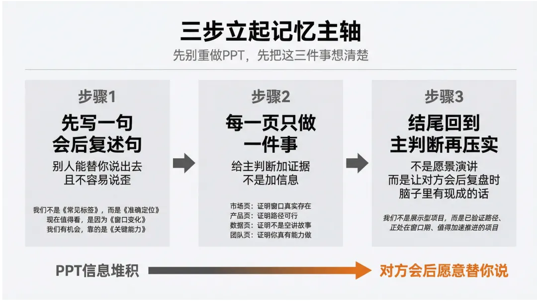 主轴不立,PPT越厚,越容易散。主轴立住,很多页不用你硬推,对方自己会往下问。