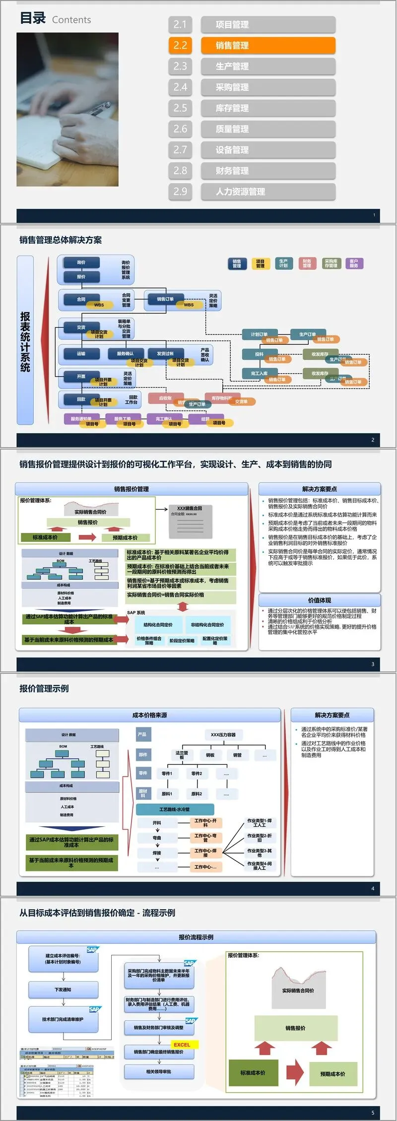 在具体业务解决方案方面,方案设计了完整的项目管理体系。通过WBS工作分解结构,将销售合同、项目计划、生产执行和成本核算紧密衔接,实现项目全生命周期管理。在销售管理领域,方案构建了从销售报价、合同管理到发货开票的完整流程,特别针对大型装备制造行业的特点,设计了分批交货、装箱发运等特色功能。