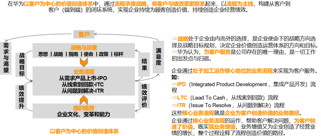 华为对流程的核心定位,是 “业务增长的管道”,而非内部管控的工具。区别于绝大多数企业以管控为核心的流程设计逻辑,华为的流程管理体系,始终围绕 “以客户为中心” 的核心价值观,构建了从客户中来、到客户中去的端到端价值创造体系。