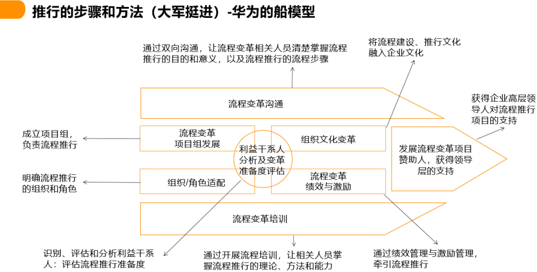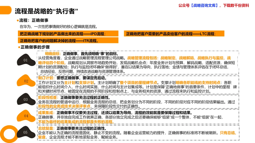第一,流程是核心,以过程的确定性保障结果的确定性。在流程再造的过程中,流程本身是核心载体,但绝大多数企业管理者都陷入了 “唯结果论” 的误区,只关注最终的业绩结果,而不关注流程的运行过程。华为的管理逻辑是:结果是过程的必然产物,只有保障了过程的准确、及时和高质量,才能实现结果的可预期、可复制。华为的流程再造,核心是把业务运作的最佳实践固化到流程中,为过程的高质量输出提供完整的保障机制,而不是靠管理者的个人经验、靠员工的个人能力去保障结果。很多企业的增长依赖少数 “明星员工”,一旦核心人员流失,业务就会出现大幅波动,而华为通过流程再造,把个人能力转化为了组织能力,即使是普通员工,按照标准化的流程执行,也能持续输出稳定的业务结果,实现了增长的可持续性。