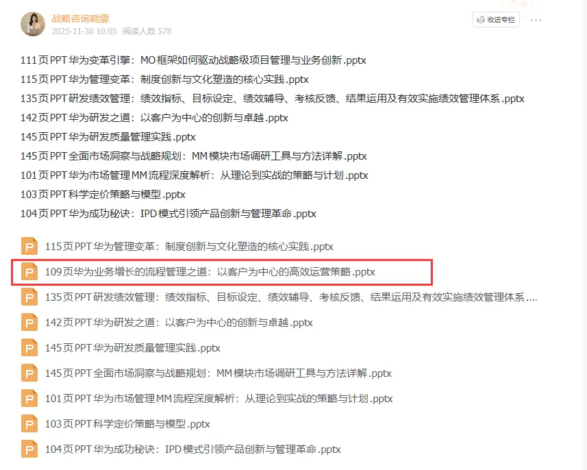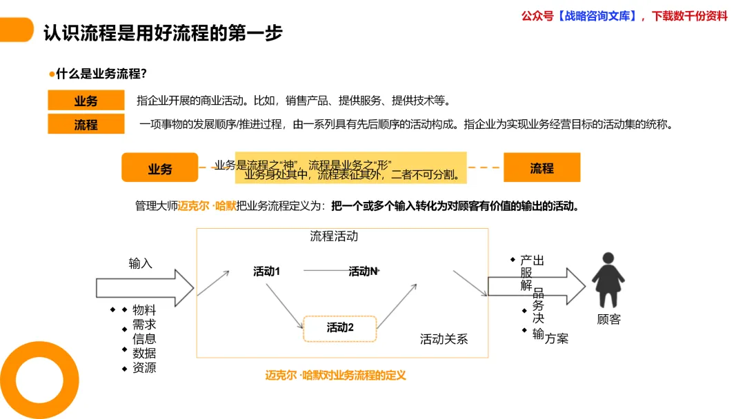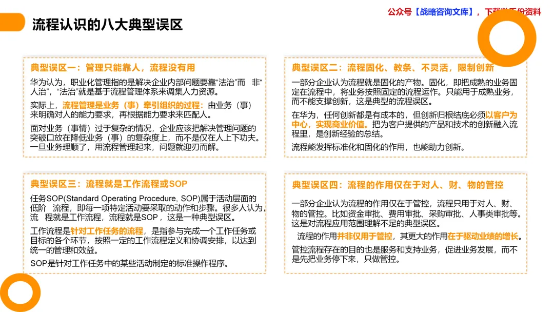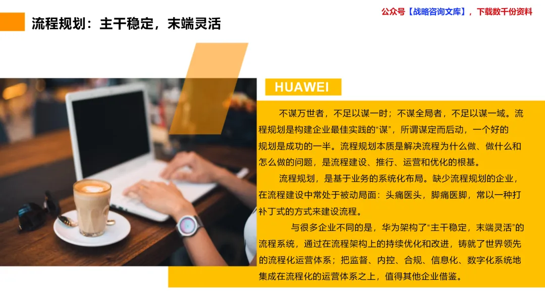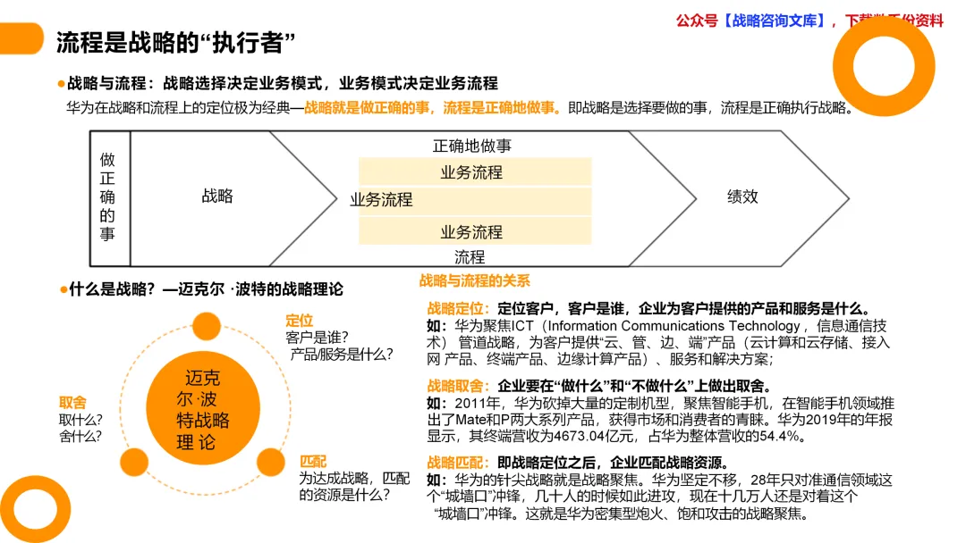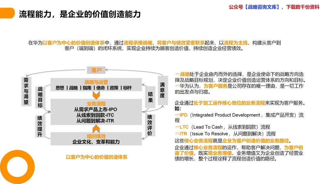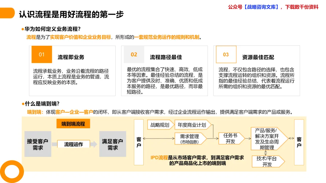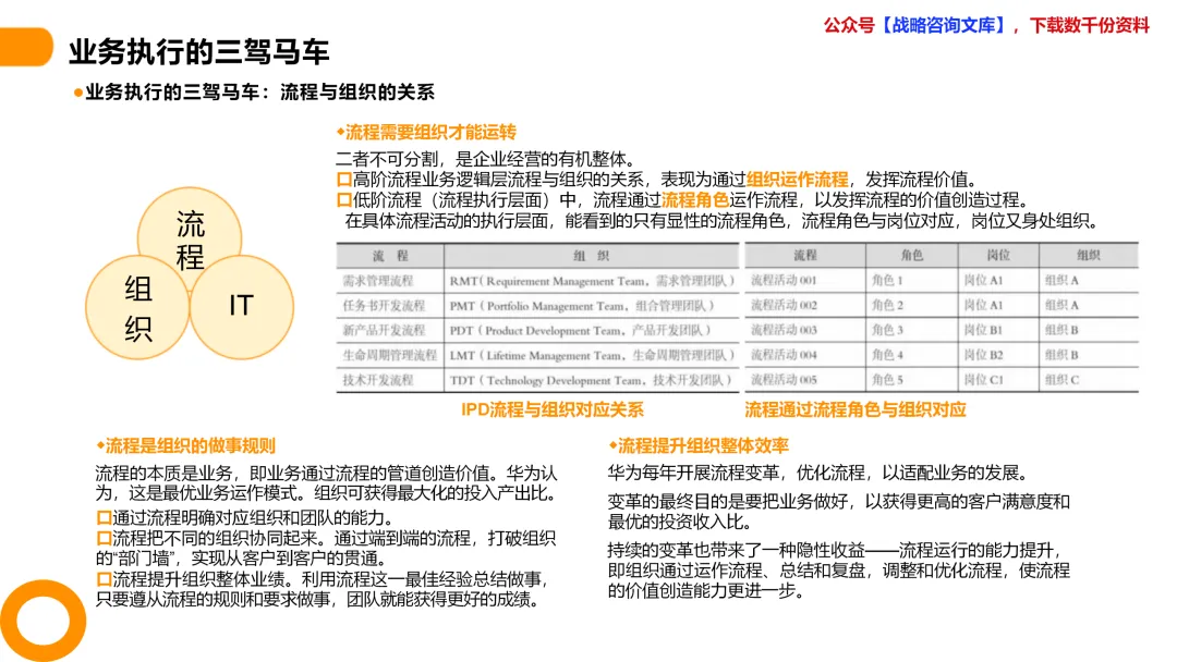 华为三十余年持续穿越周期、实现高效增长的底层密码,从来不是风口红利或能人驱动,而是一套可复制、可迭代、以客户价值为核心的业务管理体系。在这套体系中,流程是业务增长的核心管道,是把战略转化为执行、把个人能力转化为组织能力的核心载体。本文将从华为流程管理的底层逻辑、流程再造的核心法则、战略与流程的匹配机制、流程落地的九大核心要素四个维度,全面解码华为高效增长的业务管理内核。一、业务管道:华为流程管理法,构建以客户为中心的价值创造闭环