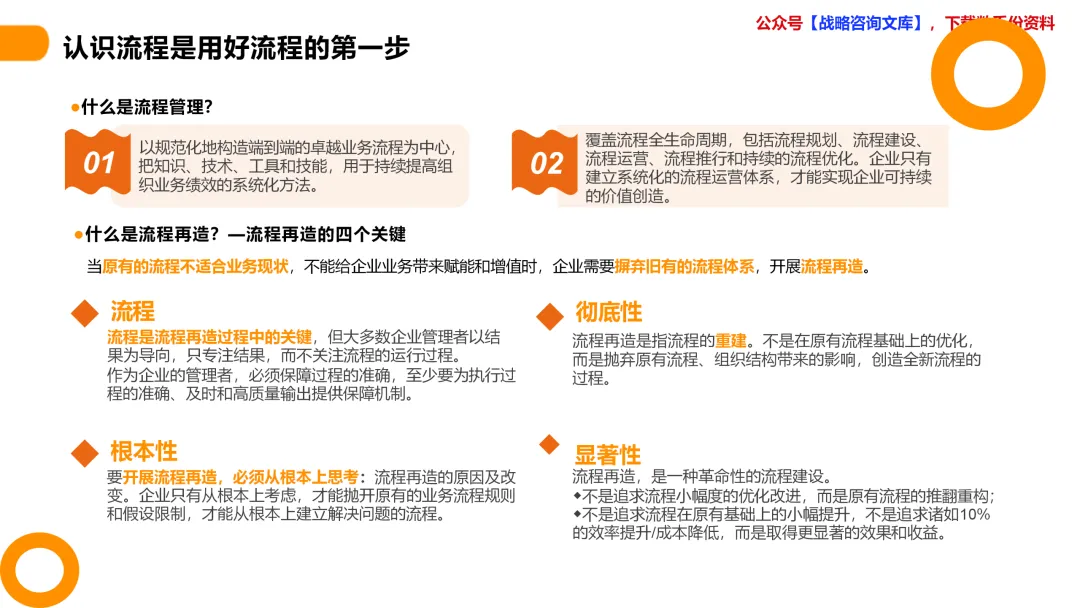第四,显著性,是流程再造的最终目标。流程再造是一种革命性的流程建设,其目标不是追求小幅度的优化改进,而是实现业绩的显著性提升。华为对流程再造的效果要求,从来不是 10% 的效率提升或成本降低,而是质的飞跃。比如华为 IPD 流程落地后,产品研发周期缩短了 50% 以上,产品上市故障率下降了 70%,研发资源浪费减少了 40%,实现了研发效率和产品质量的革命性提升。很多企业把流程优化和流程再造混为一谈,每年对流程做一些小修小补,追求几个百分点的效率提升,根本无法突破业务增长的瓶颈。流程再造的核心,是要推翻已经无法适配业务发展的原有流程体系,实现业务效率、质量、成本的显著性改善,为企业增长注入全新的动力。