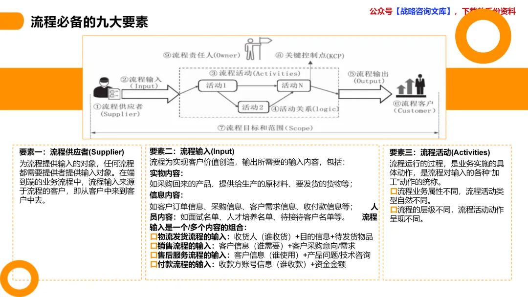 要素二:流程输入 (Input),即流程需要处理的核心对象,包括客户需求、信息、物料、资源等。华为对流程输入设置了明确的准入标准,不合格的输入严禁进入流程,避免流程在执行过程中出现反复返工、资源浪费的问题。