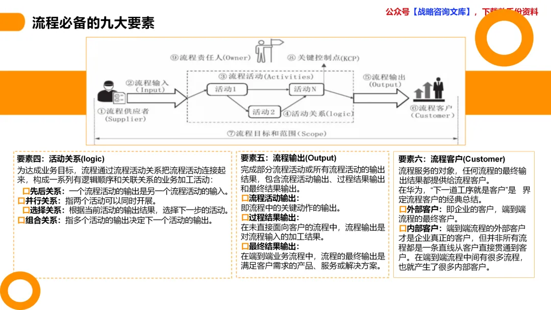 要素一:流程供应者 (Supplier),即流程输入的提供主体,既可以是企业内部的上游流程环节,也可以是外部的供应商、客户。华为要求每一个流程都必须明确供应者的责任和输出标准,确保流程输入的稳定性和合格性,从源头规避流程偏差。