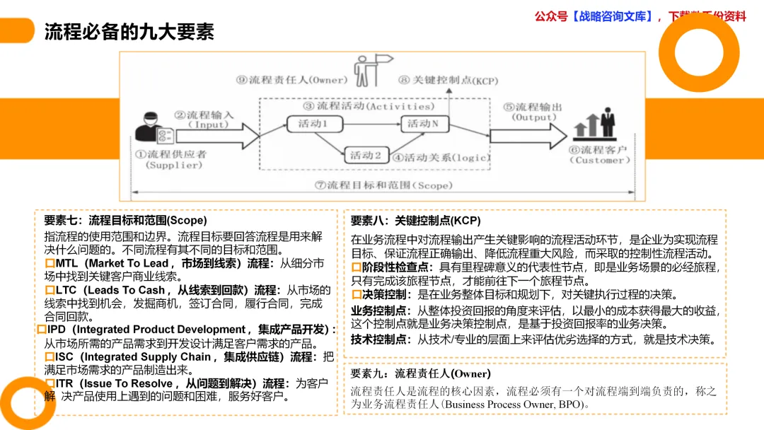 华为的流程体系之所以能够高效落地、持续迭代,核心在于其每一个流程都由九大不可或缺的核心要素构成,形成了完整的、闭环的流程管理体系,确保流程从设计、执行到优化的全生命周期都可控、可落地。