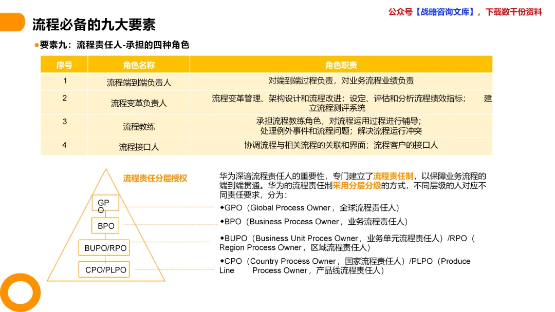 要素九:流程责任人,即流程的全生命周期负责人,承担流程设计者、执行者、监督者、优化者四大核心角色。华为的每一个流程,都设置了唯一的流程责任人,对流程的最终结果负全责,彻底打破了部门之间的责任推诿,实现了端到端的闭环管理。