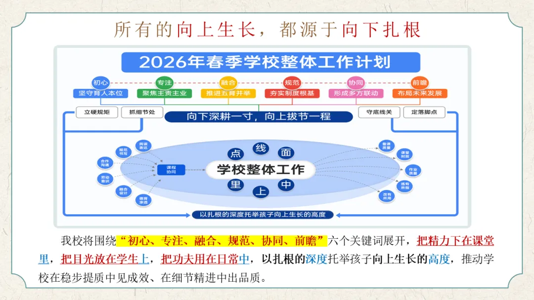 这份《2026年春季学期学校整体工作计划》以“向下深耕一寸,向上拔节一程”为核心意象,围绕“初心、专注、融合、规范、协同、前瞻”六个关键词,构建了一幅系统完整、层次清晰、落地有力的学校发展蓝图。这不仅是一份工作计划,更是一份教育理念的实践宣言,一份管理智慧的凝练表达。