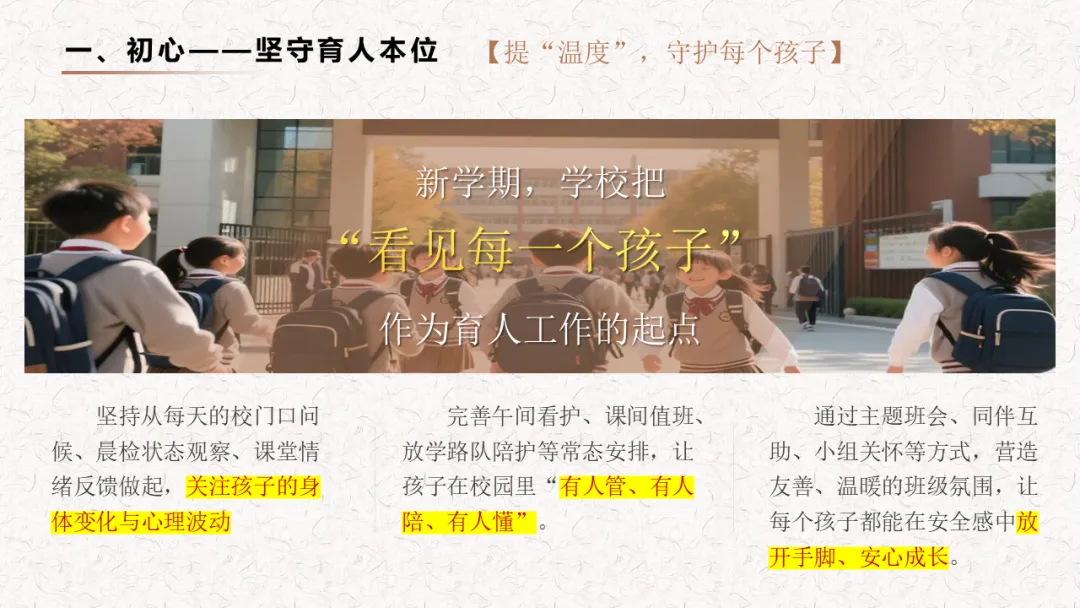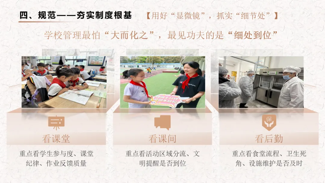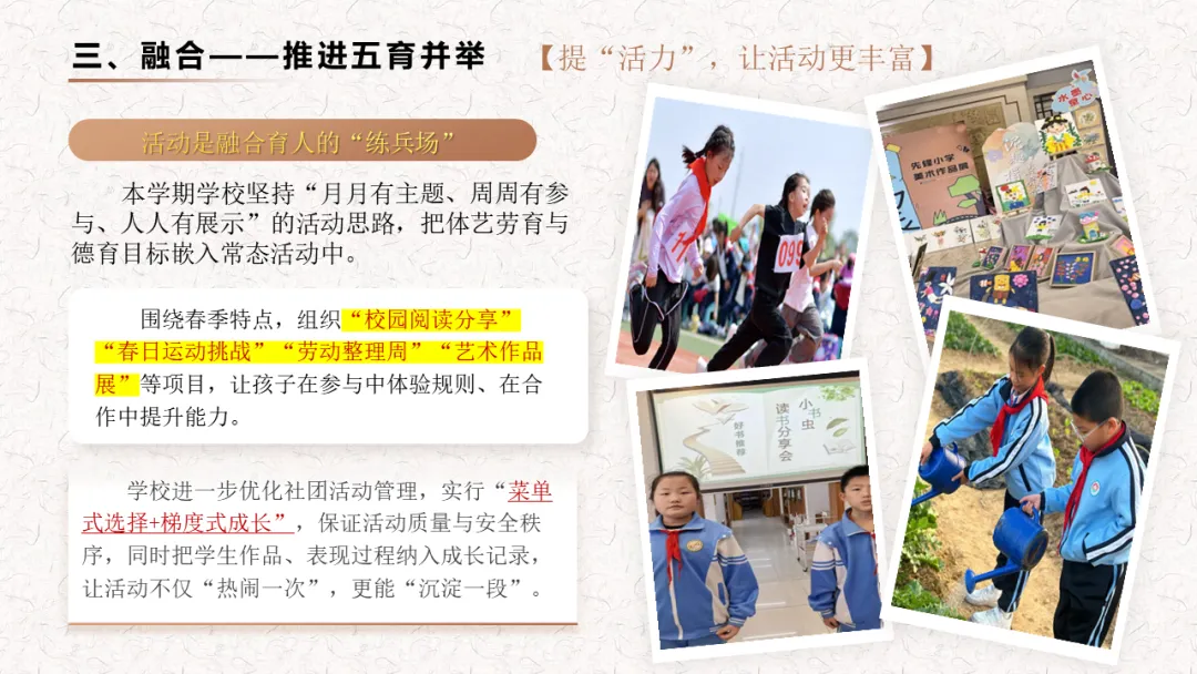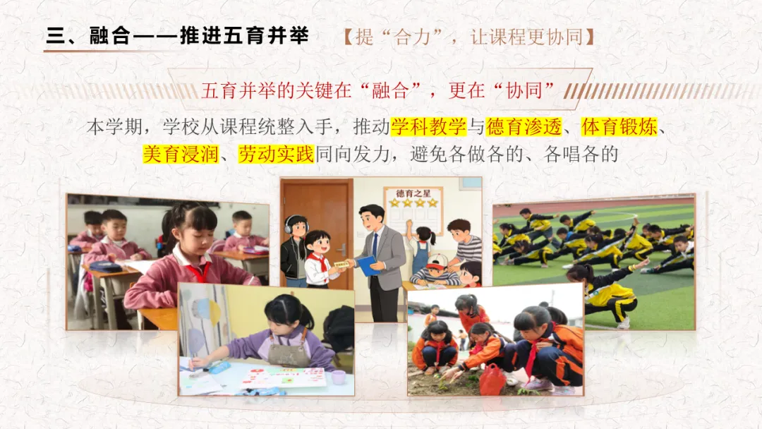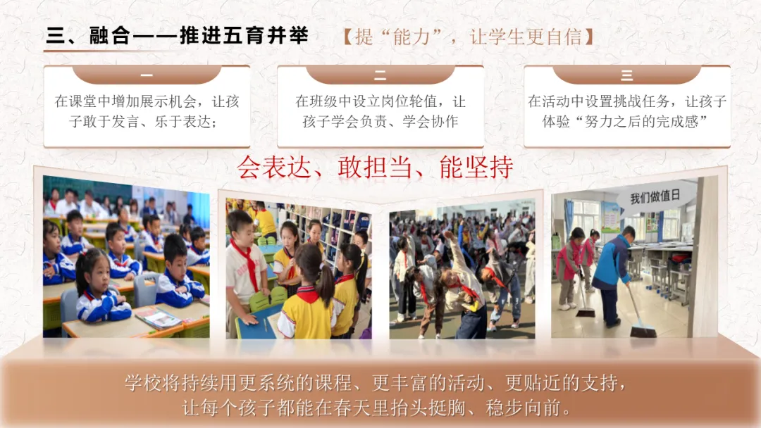 融合——推进五育并举:从课程统整入手,推动学科教学与德育渗透、体育锻炼、美育浸润、劳动实践同向发力;坚持“月月有主题、周周有参与、人人有展示”的活动思路,把体艺劳育与德育目标嵌入常态活动中;优化社团活动管理,实行“菜单式选择+梯度式成长”,让学生在课堂中增加展示机会,在班级中设立岗位轮值,在活动中设置挑战任务,让每个孩子都能抬头挺胸、稳步向前。
