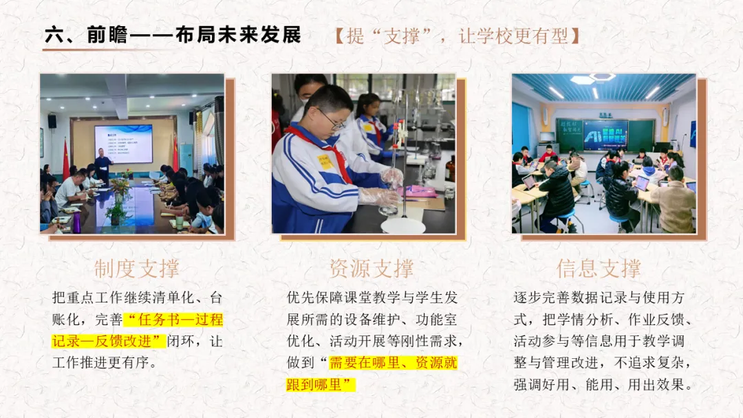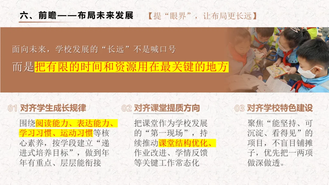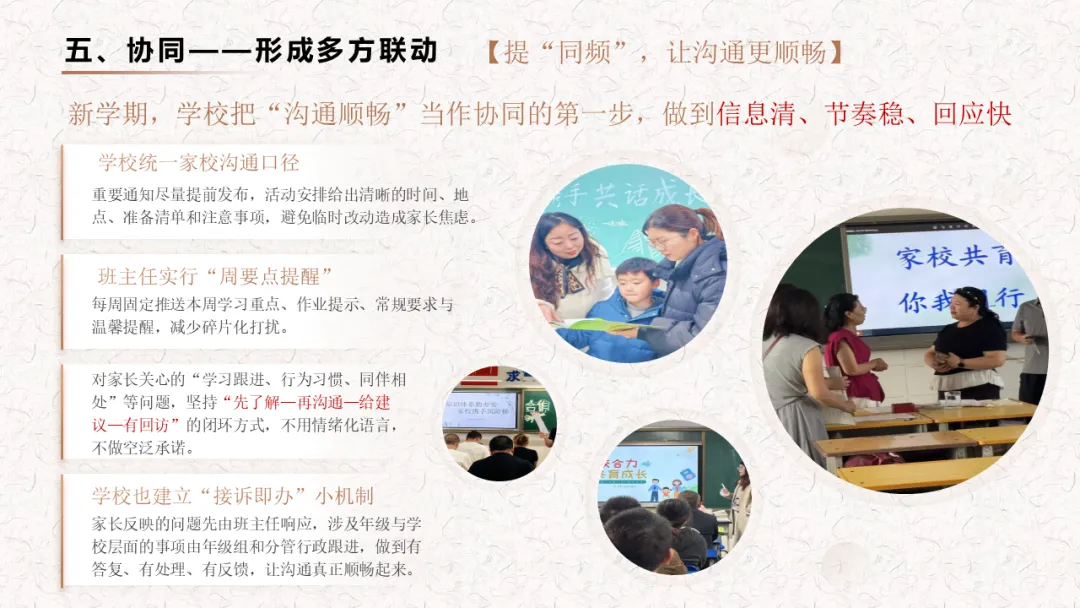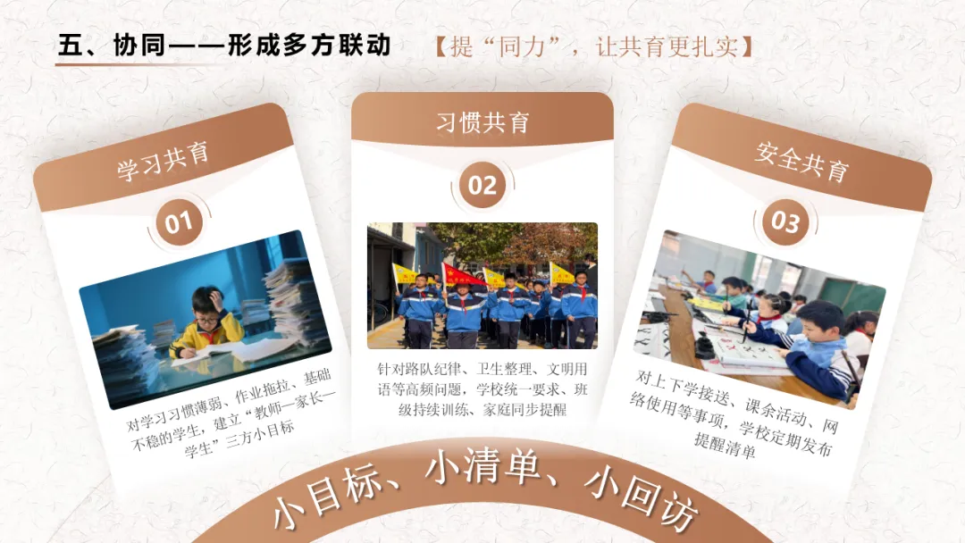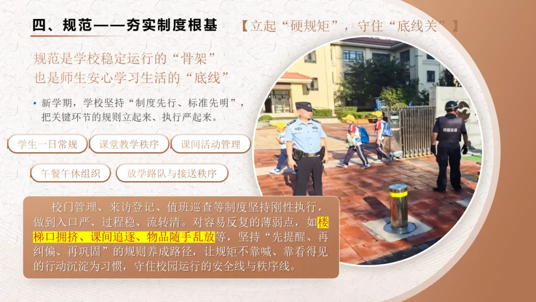 融合——推进五育并举:从课程统整入手,推动学科教学与德育渗透、体育锻炼、美育浸润、劳动实践同向发力;坚持“月月有主题、周周有参与、人人有展示”的活动思路,把体艺劳育与德育目标嵌入常态活动中;优化社团活动管理,实行“菜单式选择+梯度式成长”,让学生在课堂中增加展示机会,在班级中设立岗位轮值,在活动中设置挑战任务,让每个孩子都能抬头挺胸、稳步向前。