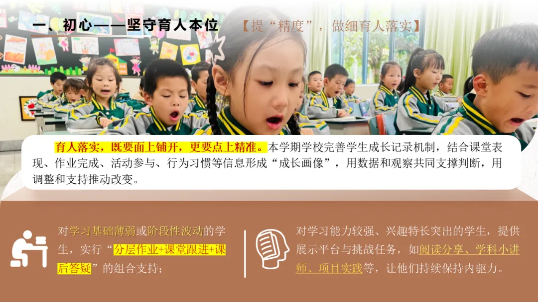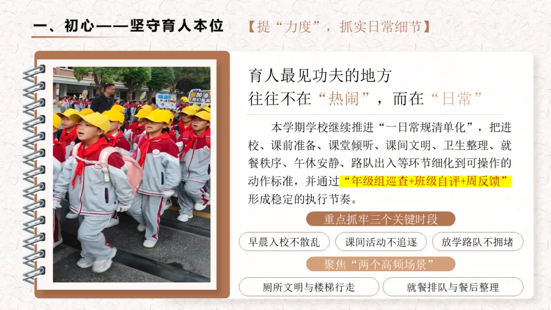 初心——坚守育人本位:把“看见每一个孩子”作为工作的起点,从校门口的问好、晨检的状态观察到课间的值班陪护,让教育有温度;通过“一日常规清单化”,把进校、课前准备、课堂倾听、课间文明、卫生整理等环节细化为可操作的动作标准,让育人有力度的同时更有精度;完善学生成长记录机制,形成“成长画像”,对学习基础薄弱的学生实行“分层作业+课堂跟进+课后答疑”,对学有余力的学生提供展示平台与挑战任务。