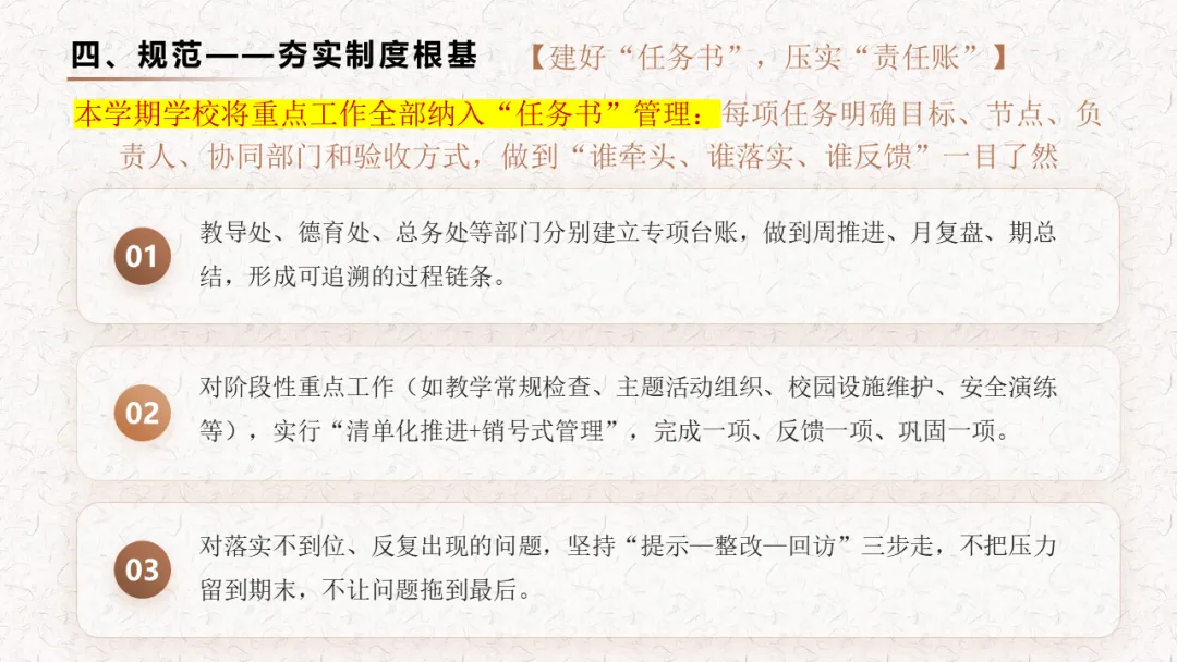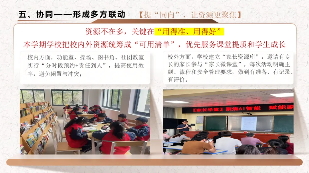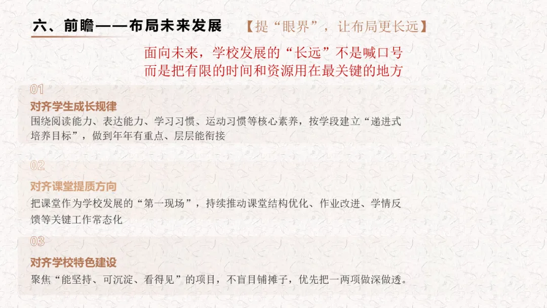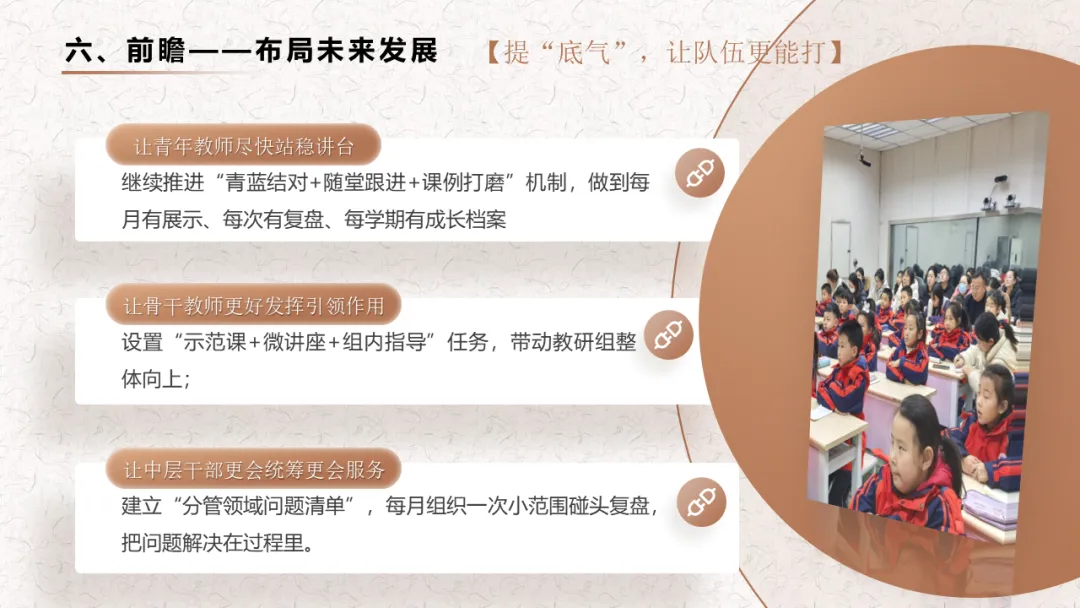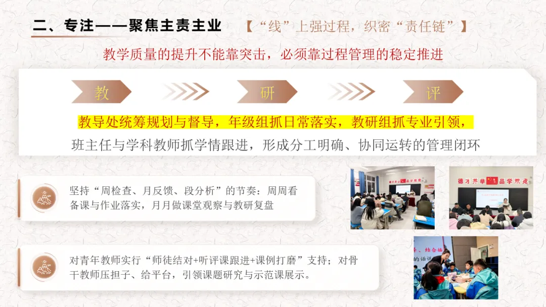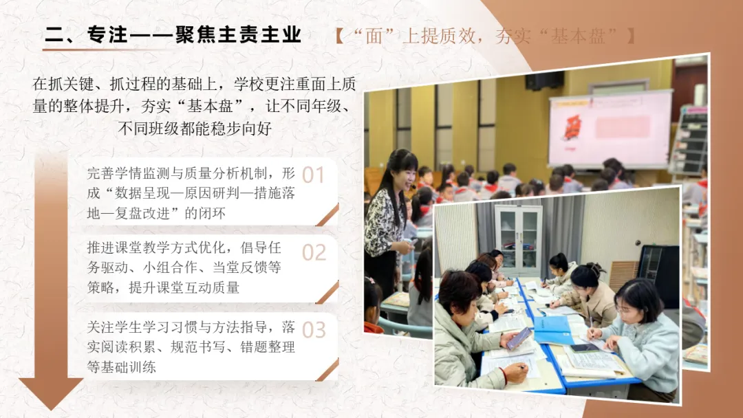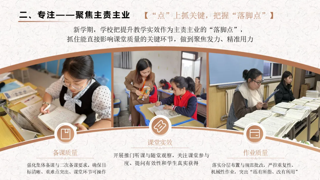 专注——聚焦主责主业:把提升教学实效作为“落脚点”,在“点”上抓关键——课堂实效、备课质量、作业质量;在“线”上强过程——织密“责任链”,教导处统筹、年级组落实、教研组引领、班主任与学科教师跟进,形成管理闭环;在“面”上提质效——夯实“基本盘”,完善学情监测与质量分析机制,推进任务驱动、小组合作等课堂策略,落实阅读积累、规范书写、错题整理等基础训练。