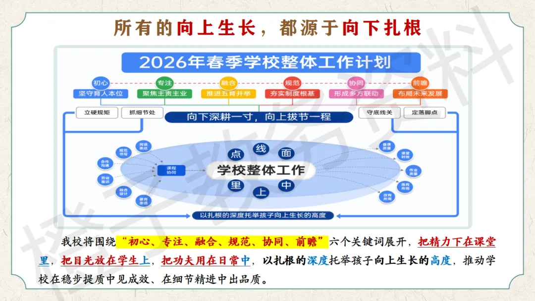 今天分享的是2026年春季学校整体工作计划PPT课件,主题是《向下深耕一寸,向上拔节一程》。