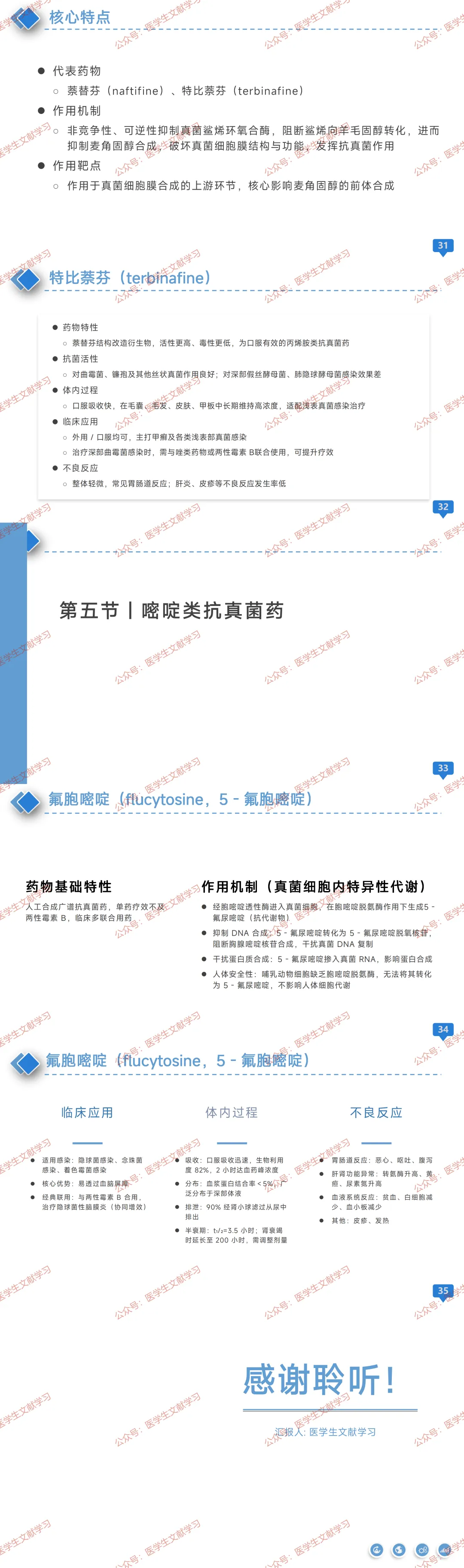 - 临床应用:主打甲癣及各类表浅部真菌感染,口服有效;治疗深部曲霉菌感染需与其他药物联用。