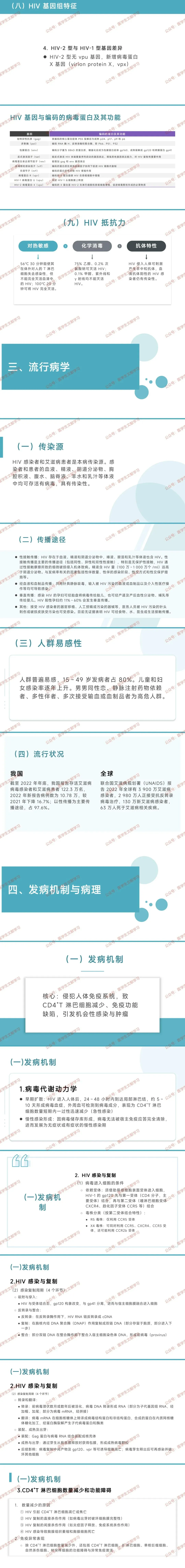 - 辅助基因:vif 促病毒复制,nrf 抑制病毒增殖,vpr 助病毒在吞噬细胞增殖;HIV-1 含 vpu(促病毒释放),HIV-2 含 vpx(促病毒增殖)。