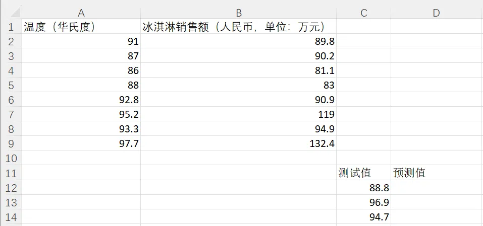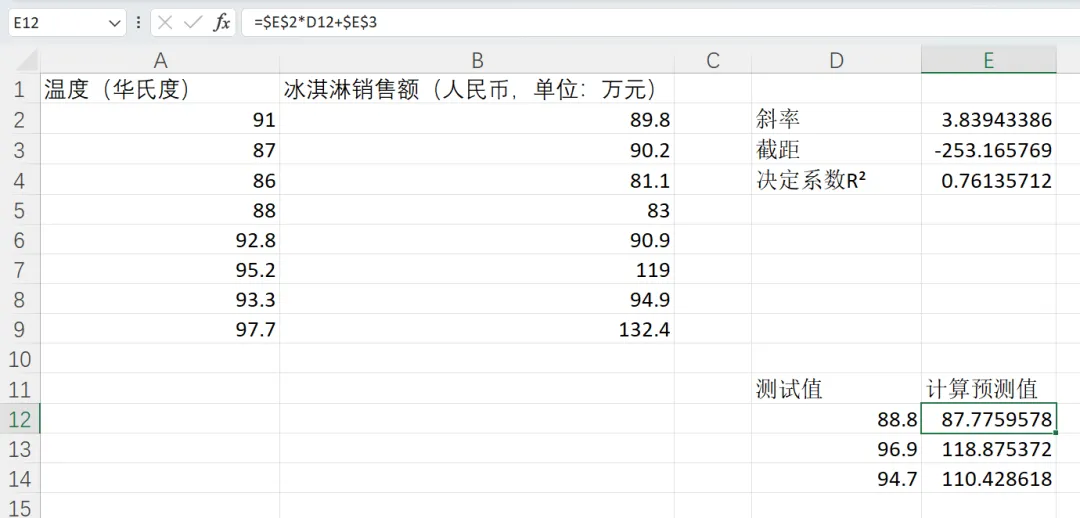 说明:如上图所示,在表格中,E2 为斜率,E3 为截距,D12 为待预测的自变量值。
