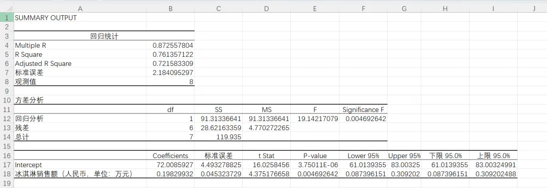 还可以关注“Significance F”(整体显著性水平),其值越小,表示整体回归模型越显著。
