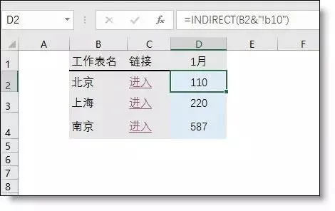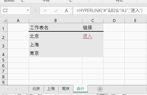 公式为:=HYPERLINK("#"&B2&"!A1","进入")- Hyperplink函数:用公式创建超链接,可将一个字符串转为超链接。