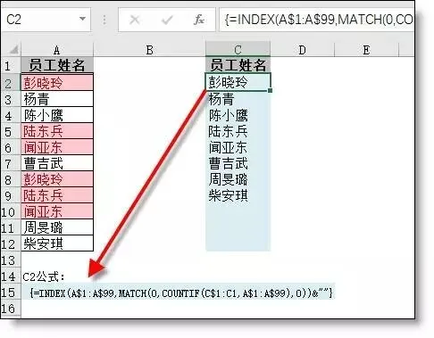 {=INDEX(A$1:A$99,MATCH(0,COUNTIF(C$1:C1,A$1:A$99),0))&""}- COUNTIF(C$1:C1,A$1:A$99):用Countif函数统计个数,若不存在,则结果为0,之后用Match(0,统计的个数,0)来查找0所在行数。