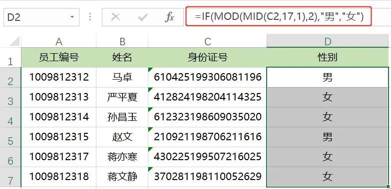 注:在18位身份证中,第17位代表性别,若为奇数,则表示男性,若为偶数,则表示女性。MOD函数为取余函数,与2相除来取余,以判断奇偶数。