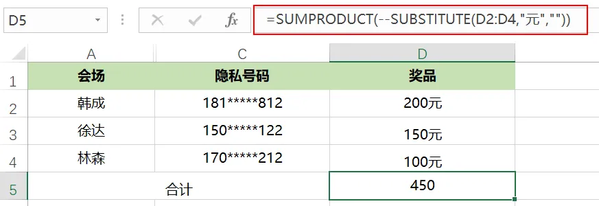 =SUMPRODUCT(--SUBSTITUTE(D2:D4,"元",""))