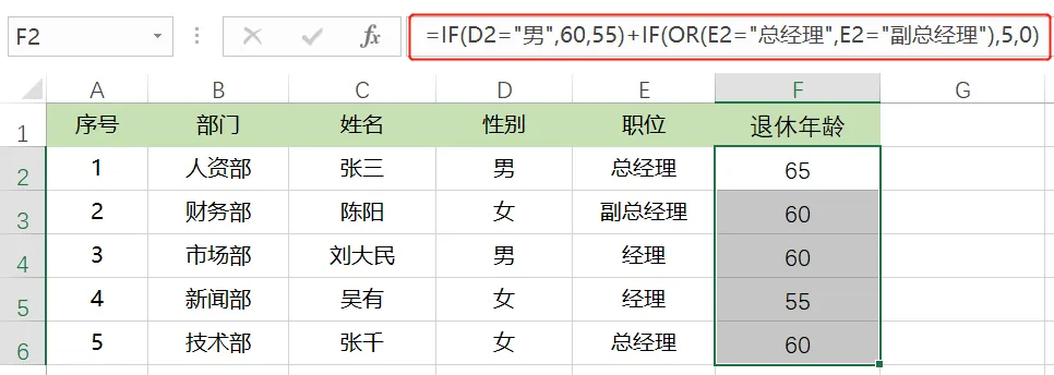 由于男性退休年龄为60,女性退休年龄为55,若为总经理或副总经理,则可以推迟5年退休。在F2中,输入公式为: