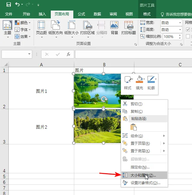 2. 在图片上右击,打开右键菜单,然后选择“大小和属性”选项