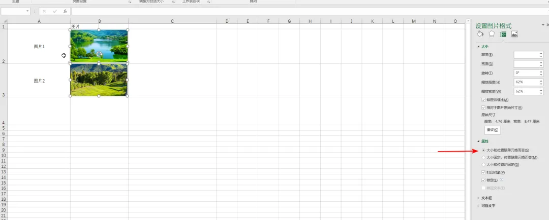 3. 在打开的“设置图片格式”侧边栏,勾选“属性”下面的“大小和位置随单元格而变”