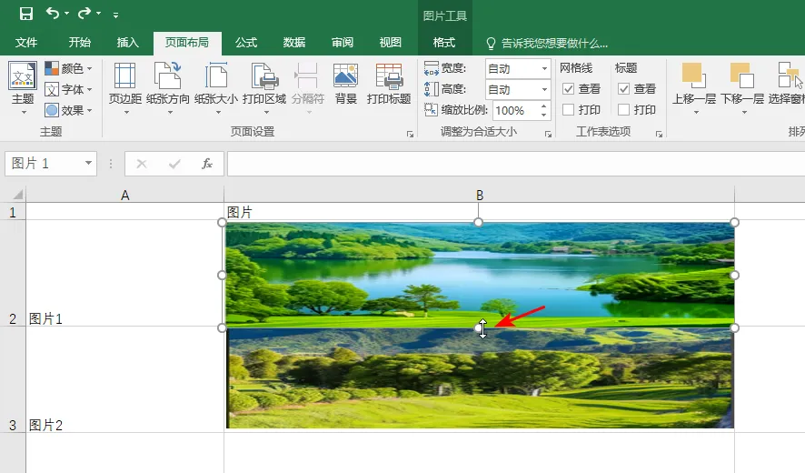 5. 遇到问题,但是向下拉的时候,图片高度并没有变化,这是因为图片没有覆盖整个单元格,所在单元格中间有空白;只需要把鼠标如下图所示,当鼠标变为上下双箭头的时候,拉动图片,让图片高度变高一些,覆盖住空白就可以了。